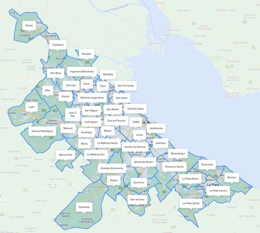 ∗ Llegamos a CABA - 3 de Febrero - Almirante Brown - Avellaneda - Berazategui - Berisso - Campana - Cañuelas - Del Viso - Derqui - Ensenada - Escobar - Esteban Echeverría - Ezeiza - Florencio Varela - Garin - General Rodríguez - Guernica - Hurlingham - Ingeniero Maschwitz - Ituzaingó - José C. Paz - La Matanza - Lanús - La Plata - Lomas de Zamora - Luján - Malvinas Argentinas - Marcos Paz - Merlo - Moreno - Morón - Nordelta - Pilar - Quilmes - San Fernando - San Isidro - San Martín - San Miguel - San Vicente - Tigre - Vicente López - Villa Rosa - Zárate.